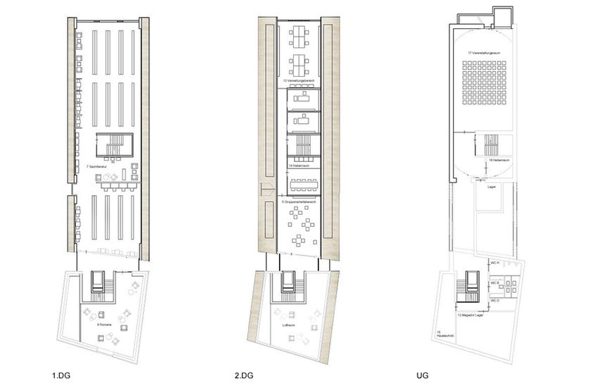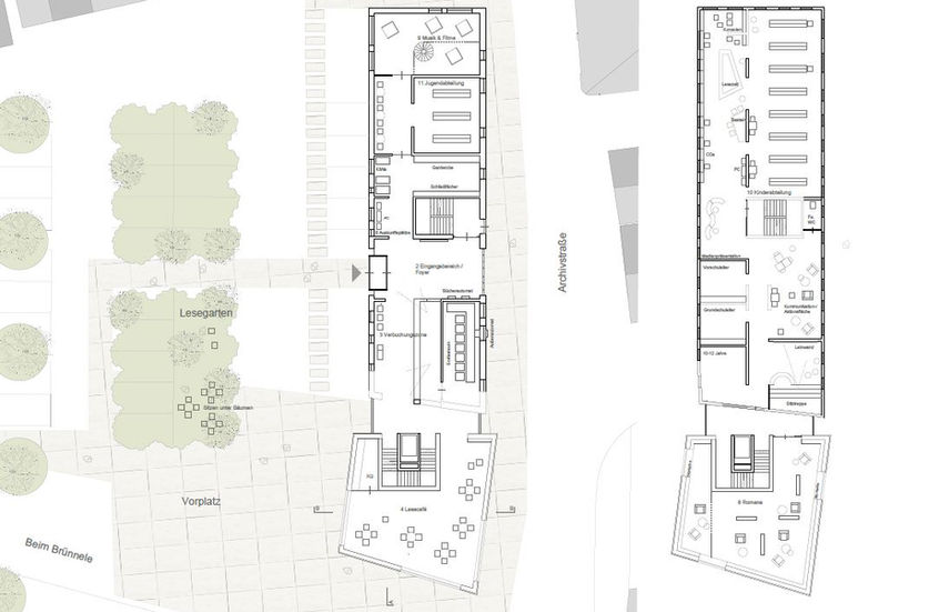 Über den Eingang und das Foyer im Denkmal kommt der Besucher direkt an der zentral gelegenen Verbuchung Erdgeschoß an. Auf kurzen Wegen erreicht er die Jugendabteilung und das Café, welches einladend monolithischen Kopfbau untergebracht wurde. Eine direkte Verbindung zum Lesehof besteht. Über die lichtdurchflutete vertikale Erschließung in der Fuge zwischen Denkmal und neuem Anbau gelangt barrierefrei zu den Romanen, Sachbüchern und der Kinderabteilung. Die Verwaltung ist im Dachgeschoß untergebracht. Auf diesem Weg ergeben sich interessante Ausblicke auf die Innenstadt von Schorndorf.